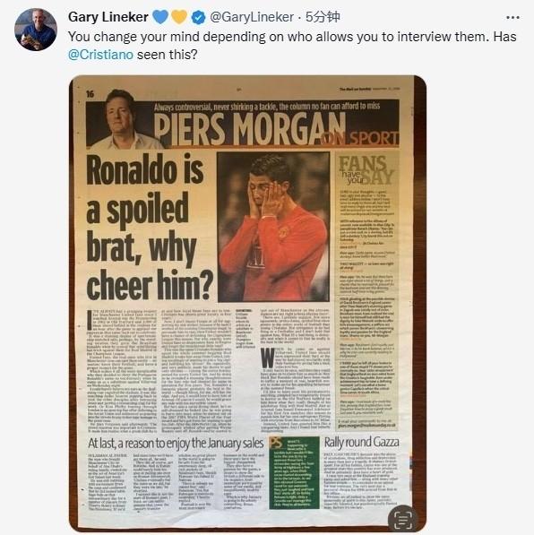 尽管莱因克尔的观点得到了绝大多数球迷的认可,但也有一些不同的声音。英国著名主持人摩根转发并莱因克尔吹爆梅西的动态后,以嘲讽的口气进行了回击。