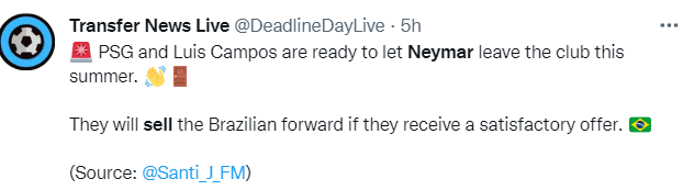 如果巴黎今夏收到合适的报价,那么总监坎波斯不会挽留这位巴西球星。卡塔尔财团对内马尔也有相同态度,俱乐部几个月前就已经准备好兜售他。