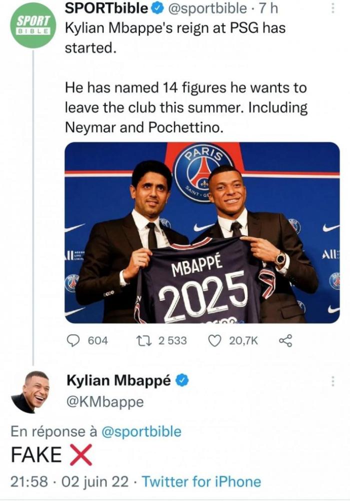 但姆巴佩今天转发了这条新闻,并写道:“假消息。”