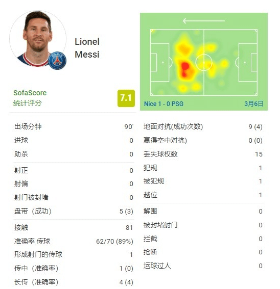 24直播网讯3月6日讯 消息,在巴黎爆冷不敌尼斯的比赛中,梅西交出了0射门0进球0助攻和0过人的数据。
