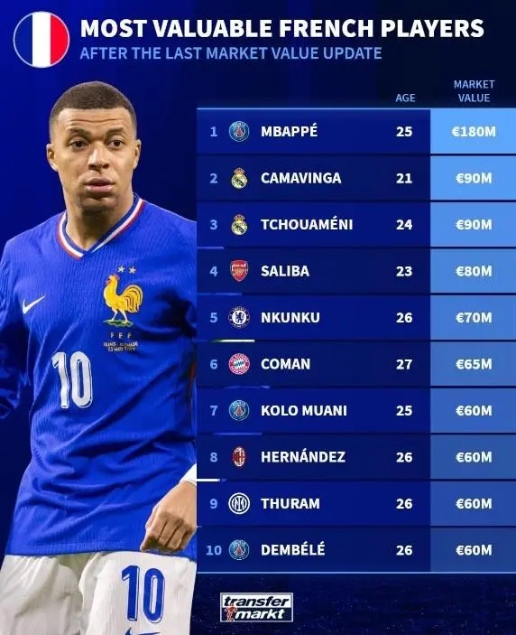 亿元先生驾到!姆巴佩1.8亿身价领跑法国球员榜
