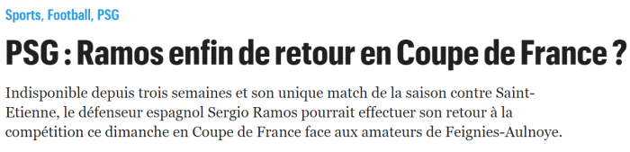 《巴黎人报》表示,拉莫斯在当地时间周五恢复了合练,如果他在今年合练中依然保持良好的状态,那么他极有可能在周末的法国杯中复出。
