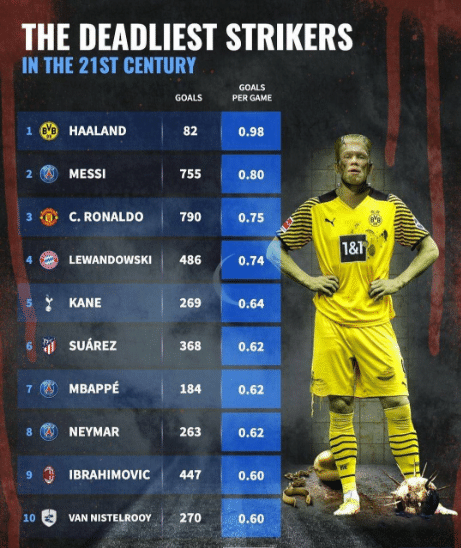 24直播网11月01日讯 进球,永远都是足球的主题,那么在本世纪,在足坛谁是进球效率最高的球员呢?近日,德国权威媒体《转会市场网》就盘点了本世纪以来,足坛球星场均进球效率的榜单,其中令人感到意外的是,梅西仅排名第二,而C罗也只排名第三,而排名第一的是哈兰德,他的效率远超梅西和C罗,不知道这个结果是否让您感到意外呢?话不多说,一起看榜单。