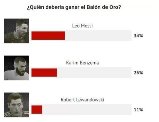 梅西获得了34%的投票,本泽马获得了26%的投票,莱万获得了11%的投票。从得票率来看,球迷非常看好梅西。