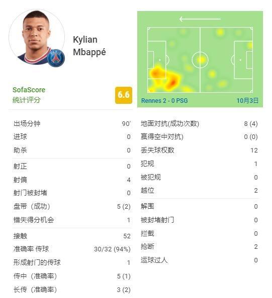 本场姆巴佩首发踢满全场,但是显然不在状态。4脚射偏、12次丢失球权。