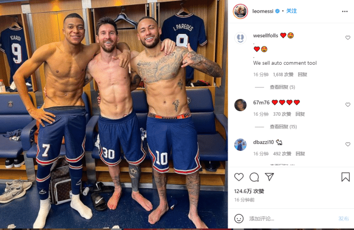24直播网9月29日讯 今天,梅西收获自己的巴黎生涯处子球,赛后他在Instagram上晒出MNM组合在更衣室的合照,并表示希望自己能为巴黎进更多球。