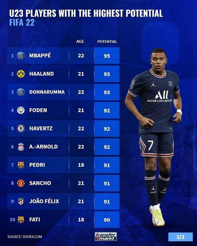 对此,《德国足球转会市场》罗列了所有23以下球员中,潜力数值排名前20的球员: