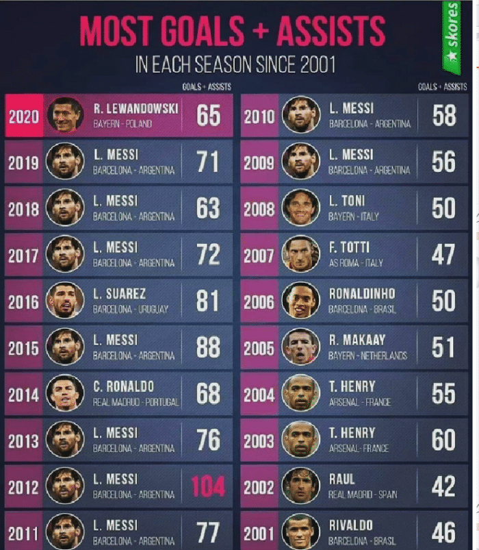 2001年年度制造进球最多的是里瓦尔多,他进球和助攻加起来有46个。而2002年是劳尔的42个,03年是亨利的60个,04年是亨利的55个,05年是马凯的51个,06年是小罗的50个,07年是托蒂的47个,08年是托尼的50个,09年开始,属于梅西的时代到来了,这一年梅西制造了56个进球,随后10年又是梅西,他这一年制造了58个进球。