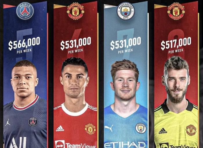 排在第7位的是曼城中场核心德布劳内,他在近期得到了一份全新的合同,目前德布劳内的薪水和C罗一样,都在53.1万美元一周。作为瓜帅手下的球队大脑,丁丁拿这样的薪水丝毫不让人意外。最后排在第8位的是曼联门将德赫亚,他的周薪达到了51.7万美元。他也是这份榜单当中唯一一位门将位置上的球员。