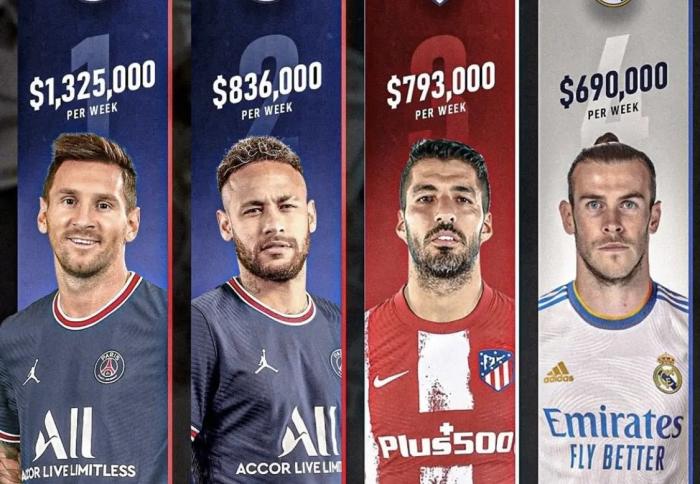 排在第1位的是巴黎圣日尔曼前锋梅西,在今夏加盟大巴黎之后。梅西得到了一份非常优厚的合同,目前他的周薪为132.5万美元。由于是ESPN统计,所以这份榜单中的计量单位被换算成了美元。不得不说,巴黎圣日尔曼可谓是给足了这位阿根廷前锋面子。在得知和巴塞罗那无法续约之后,只用了24个小时,大巴黎就敲定了和梅西的新合同。同时大巴黎并没有因为梅西当时的窘迫处境而选择压价,这份132.5万美元的周薪甚至要比巴塞罗那续约梅西后开出的薪资更高,所以梅西的薪水仍然是世界足坛第一。