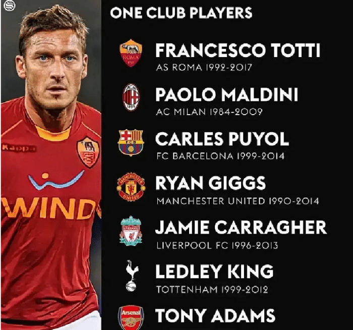 如图,罗马传奇队长托蒂:他在1992年从罗马青训营进入一线队,一直在这里踢到了2017年退役,他在罗马效力了25年,期间米兰、皇马等诸多球队都邀请过托蒂,但是托蒂一直选择坚守,可以说他是足坛最大的“忠魂”。米兰传奇队长马尔蒂尼:1984年12月,马尔蒂尼被提拔到米兰一线队,而1985年1月马尔蒂尼上演了米兰的首秀,直到2009年,马尔蒂尼在米兰退役,他也在米兰效力了25年,不过月份上没有托蒂长。