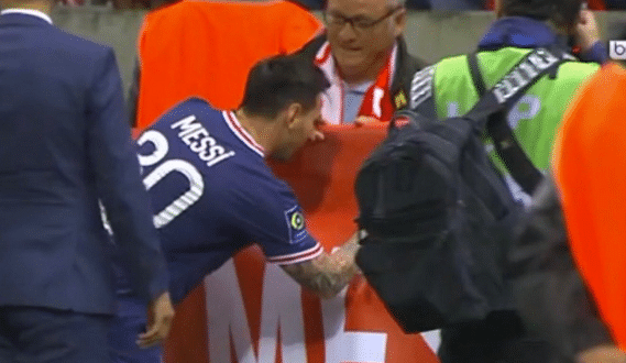 退场的时候,有一位年长的兰斯球迷希望得到梅西的签名,他在球员通道前面举着横幅,当然还有很多人拿着笔希望得到这位首秀球王的签名,梅西停下脚步,给这位年长的兰斯球迷签名,很显然这也是梅西首战送出的第一个赛场上的签名,给到了这位老者。