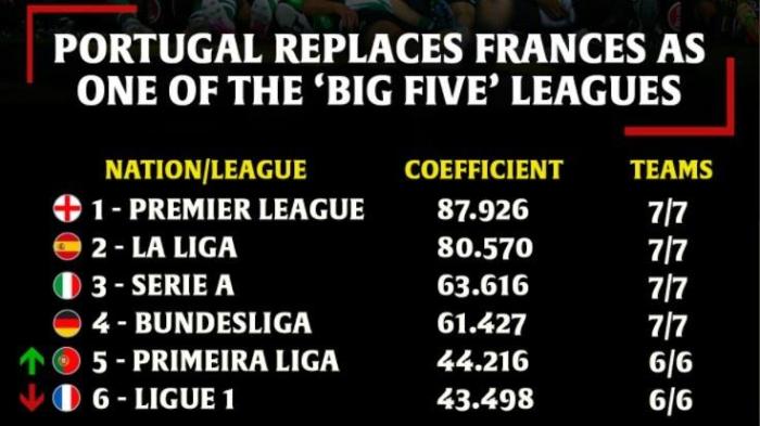 也就是说,根据欧足联规则,法甲正式掉出了欧洲五大联赛之列。