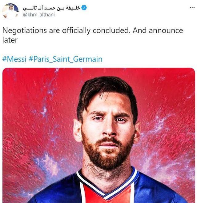 24直播网讯 据卡塔尔王室成员Khalifa Bin Hamad Al-Thani在个人社交媒体透露,梅西与巴黎的谈判已经完成。