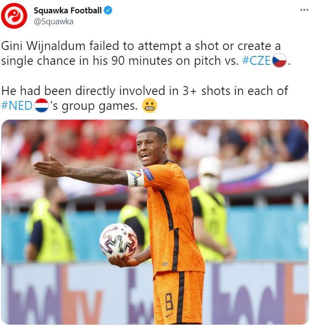 今天凌晨,荷兰在欧洲杯1/8决赛中0-2爆冷不敌捷克,惨遭淘汰。维纳尔杜姆本场比赛表现糟糕,首发踢满90分钟只有26脚触球,射门、过人和创造机会次数均为0。