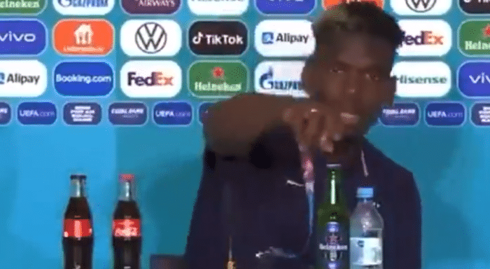 而在今天法国1-0战胜德国的比赛后,博格巴在赛后发布会上也做了类似的事情,他将桌子上的喜力啤酒拿开,喜力也是本届欧洲杯的赞助商。