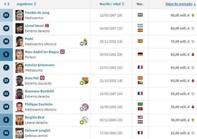 但现在,他的身价已经被德容超越,德容如今身价9000万欧元,排名巴萨队内第一,梅西则以8000万欧元排名队内第二。