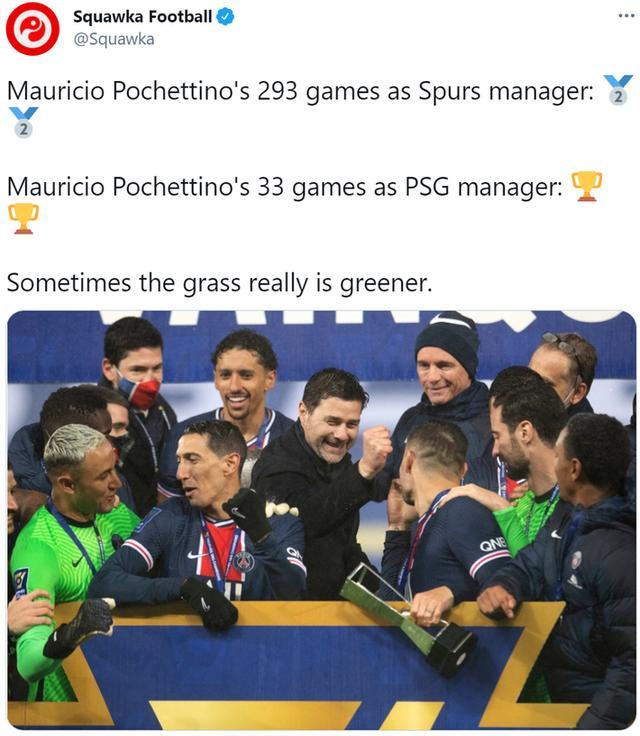 据统计,成为巴黎主帅后,波切蒂诺带队33场比赛就收获了2座冠军,而相比之下,他在热刺带队踢了293场比赛,只拿到两座亚军。
