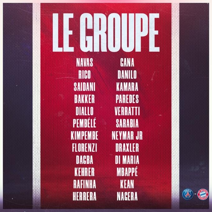 24直播网讯北京时间4月13日讯 巴黎战拜仁名单出炉,姆巴佩、内马尔领衔,纳瓦斯在列,马尔基尼奥斯缺阵。