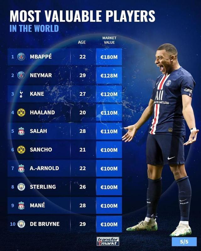 24直播网讯4月3日 德国转会市场公布了新一期球员身价,姆巴佩以1.8亿欧元占据榜首,他的队友内马尔1.28亿欧排名第二,热刺前锋凯恩以1.2亿欧身价排名第三。以下为身价前50名球员榜单。