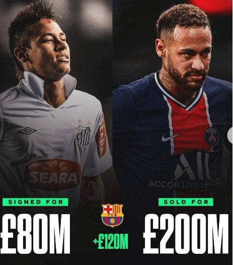 排名第一的就是姆巴佩转会巴黎交易了,2018年夏天,巴黎宣布签下摩纳哥球星姆巴佩,而摩纳哥因此赚取了1.3亿英镑,而因为姆巴佩是摩纳哥青训出身,所以等于摩纳哥净赚了1.3亿英镑。而排名第二的是内马尔转会巴黎,巴萨当初花费了8000万英镑签下了内马尔,不过随后巴黎强挖内马尔的时候,他们支付了2亿英镑的违约金,巴萨因此赚取了1.2亿英镑,不过即便如此,巴萨也不开心,因为内马尔离队之后,他们花费了好几亿引援了,都还没找到内马尔的接班人。
