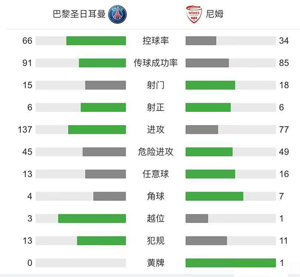 查看:巴黎圣日耳曼vs尼姆 全场录像技术统计: