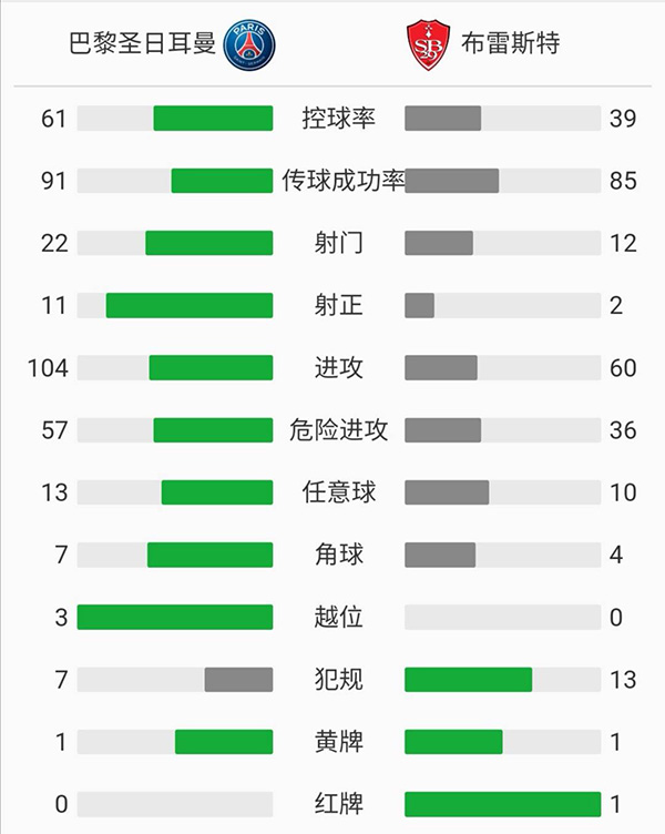 查看:巴黎圣日耳曼vs布雷斯特 全场录像技术统计:
