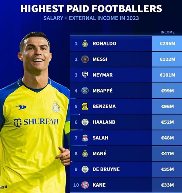 在收入层面,根据德转的统计,括了工资和球员在场外的收入,C罗的年收入高达2.35亿欧元,他除了是足坛的打工皇帝之外,在场外的商业收入也是很大,排名第一。梅西排名第一,他的2023年收入是1.22亿欧元,两位老将不论是场内还是场外的收入,都是最高的。