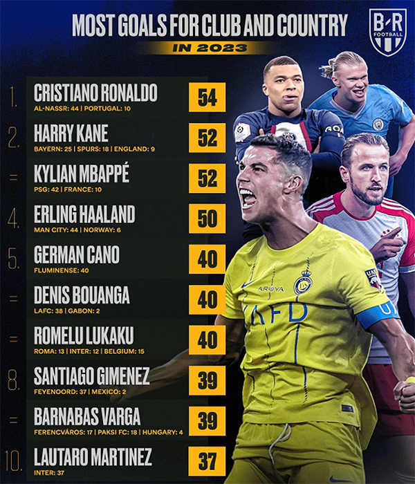 C罗在4-1击败布赖代合作的比赛中打进一球,将自己在2023年的进球数定格在54球,加冕年度射手王。54球是个人22年生涯中第7高的数据,联想到C罗已经38岁了,能够取得这样的成绩,是非常不容易的。期间C罗虽然无缘联赛冠军和国王杯冠军,但在阿拉冠层面,率队捧杯,而且获得赛事最佳射手。本赛季C罗率领的利雅得胜利在亚冠高歌猛进,打进16强。