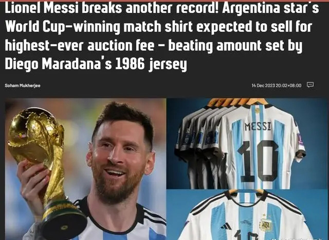 24直播网12月15日梅西的阿根廷世界杯冠军球衣有望以创纪录的价格售出,超过迭戈-马拉达纳1986 年球衣的拍卖价格。