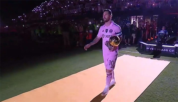 比赛开始前是梅西的第8座金球奖的庆典仪式,梅西出场,拿着金球奖,之后还单手托金球,向观众展示。