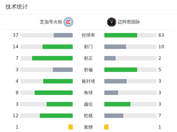 全场比赛结束,迈阿密国际1-4芝加哥火焰。