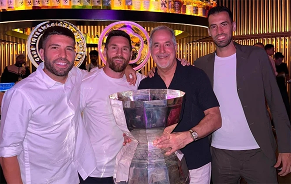 梅西、阿尔巴、布斯克茨与迈阿密国际老板Jorge Mas手捧联盟杯冠军奖杯合影,他们在一起庆祝冠军。这是迈阿密国际成立以来的第一座冠军奖杯,具有里程碑意义,所以这些俱乐部的核心成员一起庆祝。