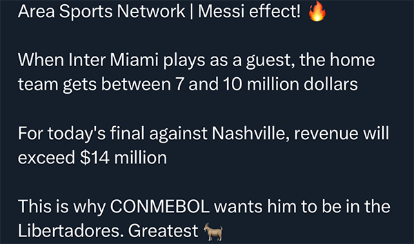 梅西夺冠,各方面都没有输家,包括主场作战的纳什维尔,他们虽然丢了冠军,但是在场外是大丰收的状态。据悉当梅西去到客场参赛的时候,对手都会获得700-1000万美元的收入。这次的北美联盟杯的关注度更高,纳什维尔将获得超过1400万美元收入,仅仅是球票层面就已经卖疯了,黄金位置超过1.2万美元,俱乐部收入激增,确实赚翻了。