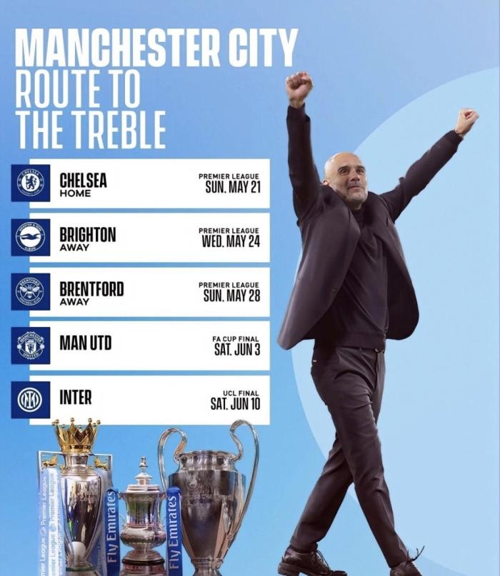 而在杀进欧冠决赛后,已经各项赛事23场不败的曼城,本赛季依然有机会实现“三冠王”的伟业。此前他们已经打进了足总杯的决赛,对手是曼联。而在联赛冠军的竞争中,曼城少赛1场领先阿森纳4分。本周末只要主场击败切尔西,他们就将实现3连冠。也就是说,曼城距离实现英格兰球队的“3冠王”只差3场胜利。