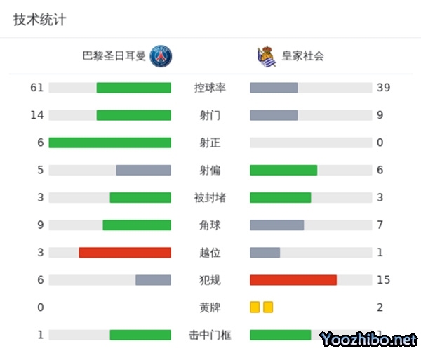 全场比赛结束,最终巴黎圣日耳曼2-0皇家社会。