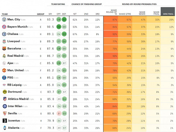 24直播网9月10日讯 大数据预测网站FiveThrtyEight最近更新了欧冠各队的夺冠概率,曼城20%最高,今夏引进了梅西等多名强援的巴黎圣日耳曼仅排名第九。
