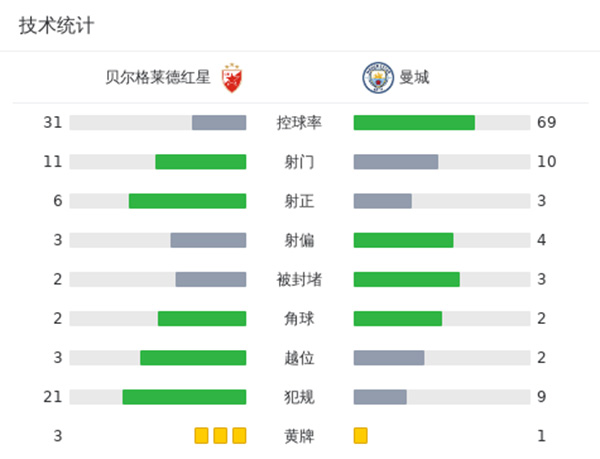 最终曼城客场3-2贝尔格莱德红星全胜头名出线。