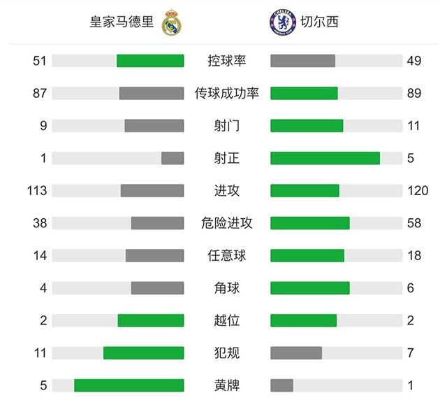 全场比赛结束,皇家马德里主场1-1战平切尔西。