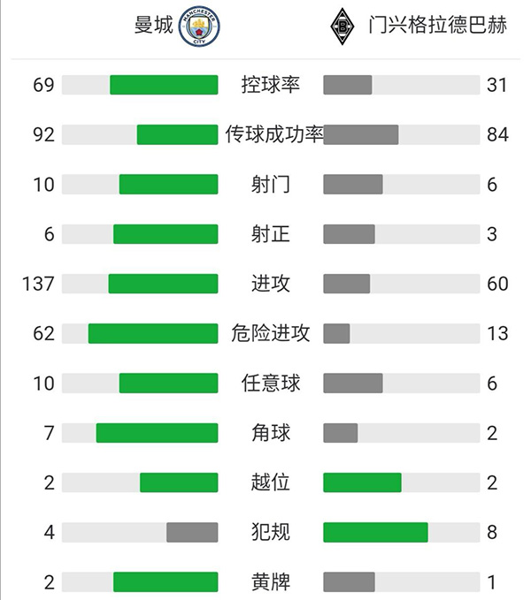 全场比赛结束,曼城在主场2-0击败门兴,两回合总比分4-0淘汰对手晋级。