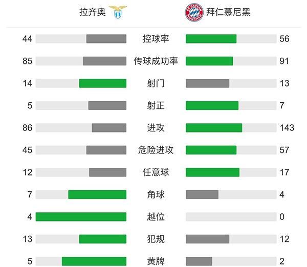 查看:拉齐奥vs拜仁 全场录像技术统计: