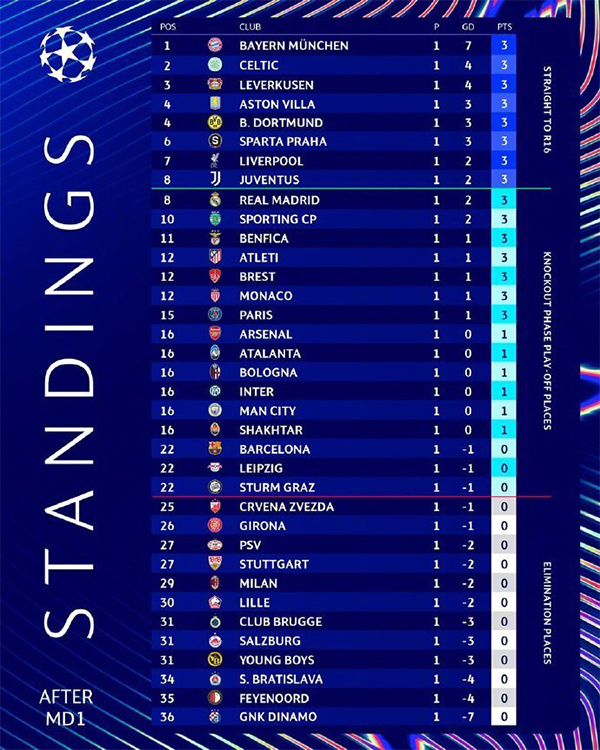 首轮比赛过后一共有15支球队成功取胜,其中9-2狂胜萨格勒布迪纳摩的拜仁,7个净胜球领跑积分榜。而凯尔特人5-1击败布拉迪斯拉发,勒沃库森则4-0横扫了费耶诺德。两队同样收获4个净胜球并列积分榜第2。阿斯顿维拉、布拉格斯巴达和多特蒙德以3个净胜球,一同排在第4位。卫冕冠军皇马因为首轮“仅”3-1击败斯图加特,因为净胜球劣势,暂时未进入前8名。