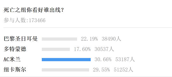 这样一个超级死亡之组也引发热议,谁都有可能出线,也都有可能被淘汰。很快有媒体发起投票,死亡之组你看好谁出线?根据数据显示,AC米兰和纽卡斯尔是更加被看好的球队,大巴黎和多特蒙德很有可能无缘小组出线。