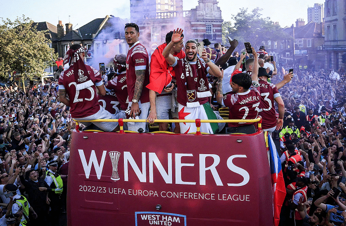西汉姆联的夺冠游行声势浩大,超过7万球迷走上街头,参加球队的冠军游行,导致东伦敦交通瘫痪。43年没有赢得过大赛冠军、58年来没有斩获过欧战冠军,如今这一切都被一座欧协杯冠军清零。夺冠仪式上,西汉姆联的主帅莫耶斯高举冠军奖杯,非常激动。
