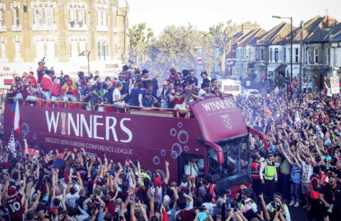 24直播网06月09日欧协杯决赛,来自英超的西汉姆联以2-1击败意甲的佛罗伦萨,斩获冠军,这是铁锤帮58年来的第一个欧战冠军,也是本赛季足球城伦敦唯一的冠军球队。球队结束比赛之后短暂庆祝,回到东伦敦继续狂欢,进行冠军游行。