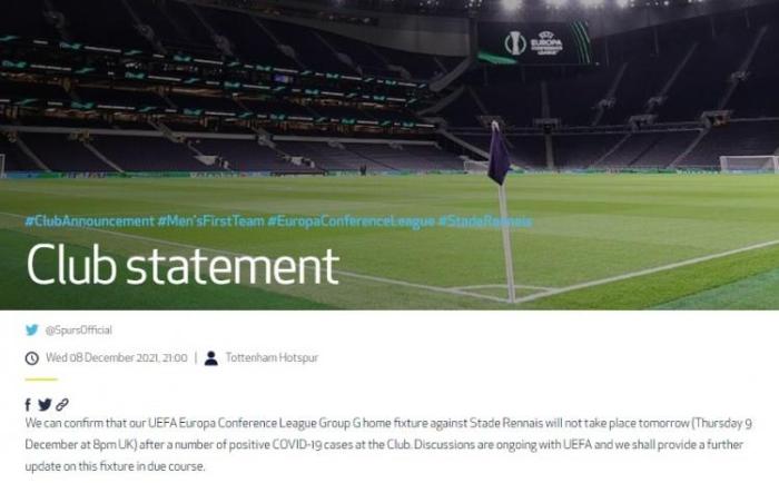 热刺将在北京时间12月10日凌晨4点在欧会杯中主场迎战雷恩,但热刺队内近期爆发新冠疫情,俱乐部已发文表示比赛不会如期举行,并称他们正在和欧足联沟通,寻找新的比赛时间。