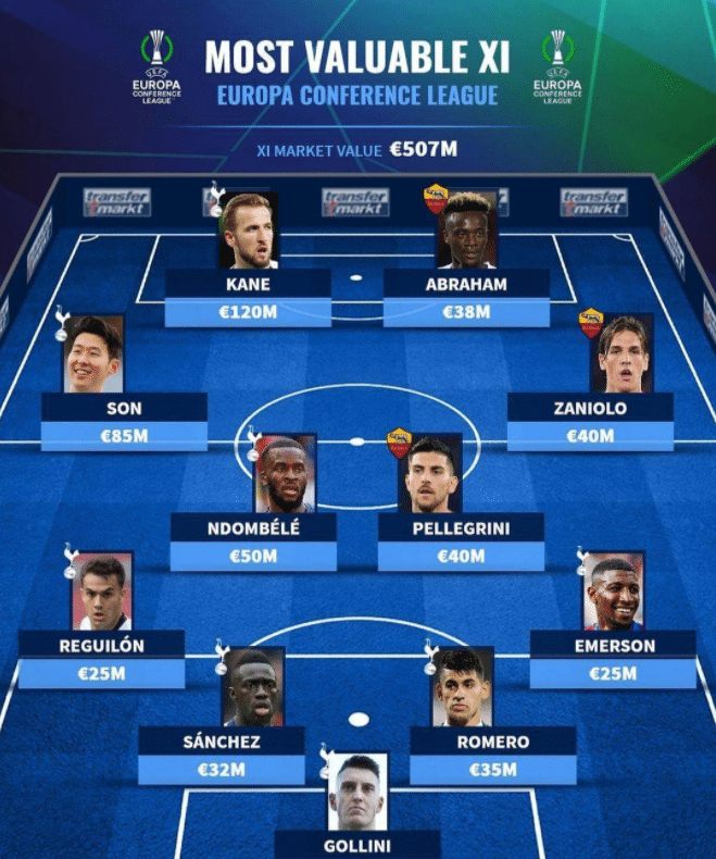 24直播网9月17日讯欧会杯的小组赛开始了,许多球队都开始猜测,到底谁能拿到本赛季欧会杯冠军。而在欧会杯的热度下,德国权威媒体《转会市场网》盘点了本赛季欧会杯的最贵阵容,而这个最贵阵容总价5.04亿欧元,球员全部来自热刺和罗马,其中热刺有8人入选,罗马有3人入选,而且其中有8名球员都曾经在穆里尼奥手下效力过。话不多说,一起看阵容。