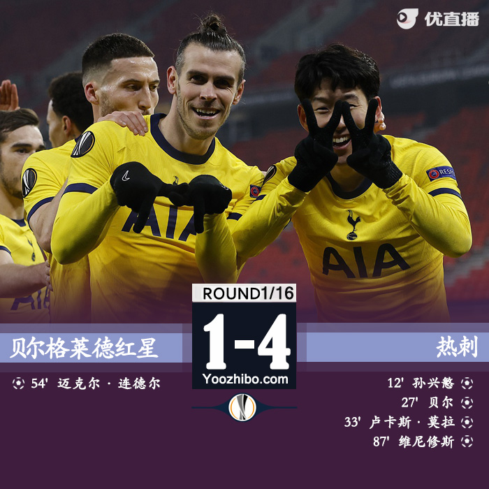 24直播网2月19日讯 北京时间2月19日01:55,欧联杯1/16决赛首回合,沃尔夫斯贝格迎战热刺。上半场,孙兴慜头球首开记录,贝尔传射,小卢卡斯一条龙破门,热刺半场3-0领先沃尔夫斯贝格。下半场,西索科送点,维尼修斯破门。最终,热刺4-1战胜沃尔夫斯贝格。