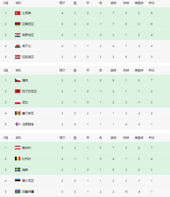 D组的竞争还是非常激烈的,土耳其3胜1负位居榜首,但身后的亚美尼亚、克罗地亚和威尔士都要机会。E组的捷克2胜1平开局不败,身后的4支球队差距并不大。F组的奥地利7分力压比利时队,近期比利时队传来了内讧,这支纸面实力不俗的球队,依旧需要调整。G组的塞尔维亚优势明显,匈牙利和黑山争夺另一个直通欧洲杯的资格。