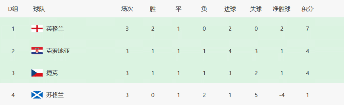D组,英格兰2胜1平不败拿到7分,以小组第一身份晋级;克罗地亚1胜1平1负积4分,打进4球丢3球以进球优势力压捷克拿到第二名,顺利晋级16强;捷克1胜1平1负积4分,打进3球丢2球,以较好的小组第三名身份晋级16强,苏格兰1分垫底,无缘16强。
